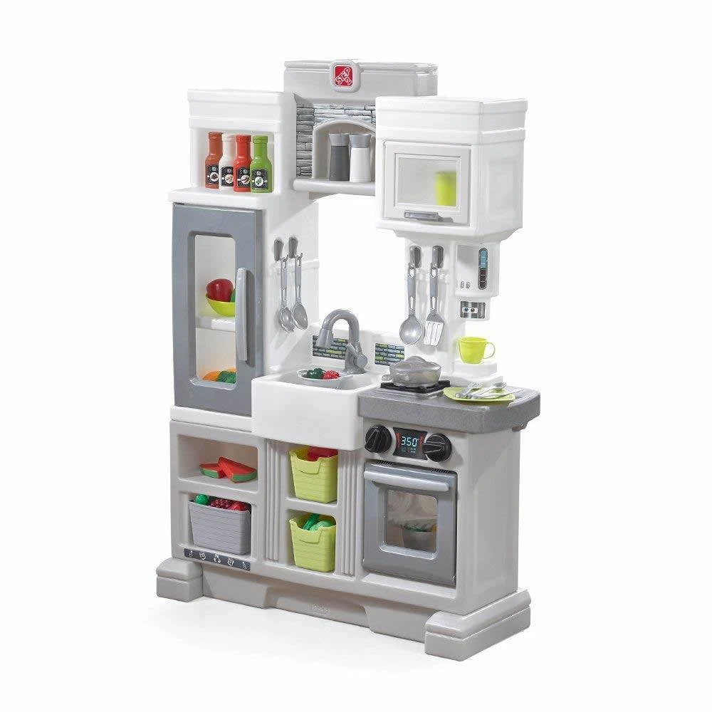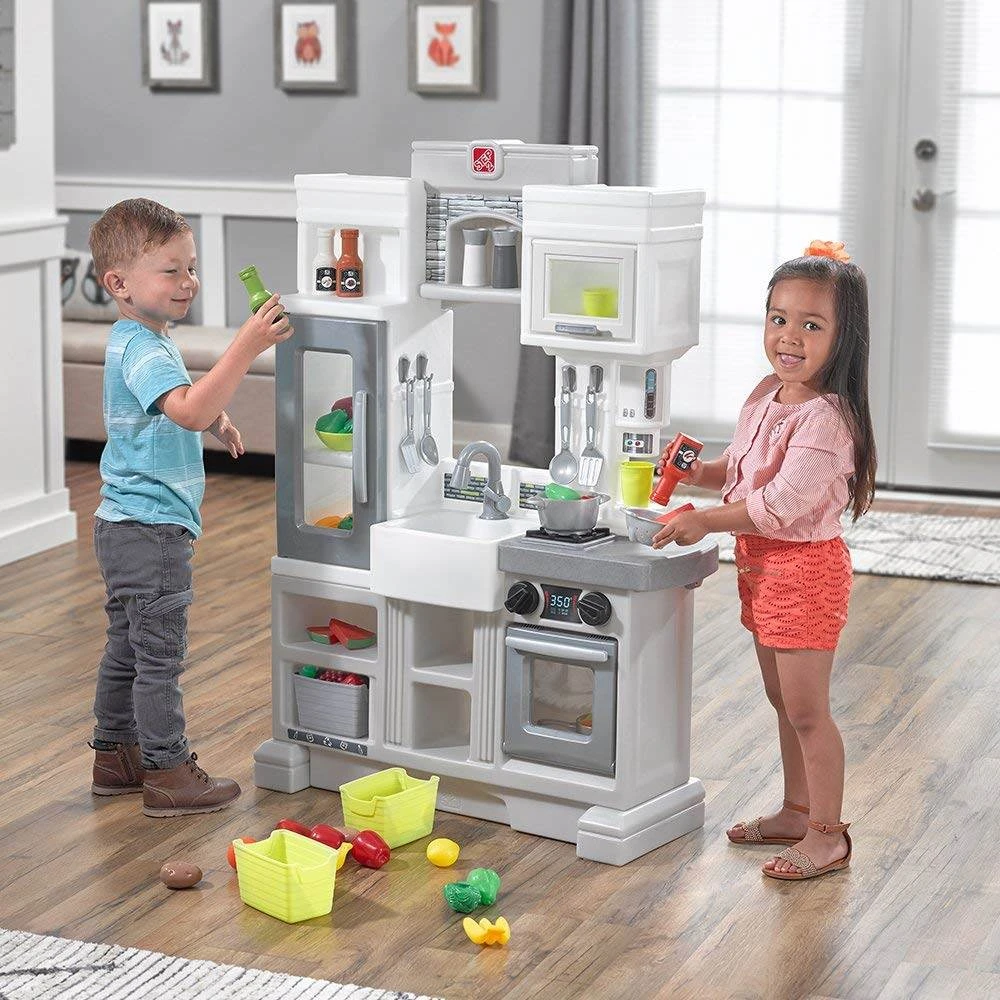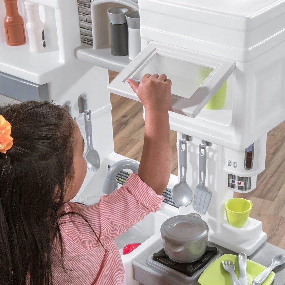 If your little one is eager to help out in the kitchen or always cuddle up against you when youβre watching Top Chef, they will love the Step2 Downtown Delights Pretend Play Toy Kitchen Set.Full of stylish details like the faux granite counter top, gooseneck faucet, and subway tile backsplash behind the sink, your kiddo can enjoy the functionalities of a grown-up kitchen in their size.Your aspiring chef will be able to whip up delicious culinary masterpieces that even Padma Lakshmi will love with this Step2 kitchen set.