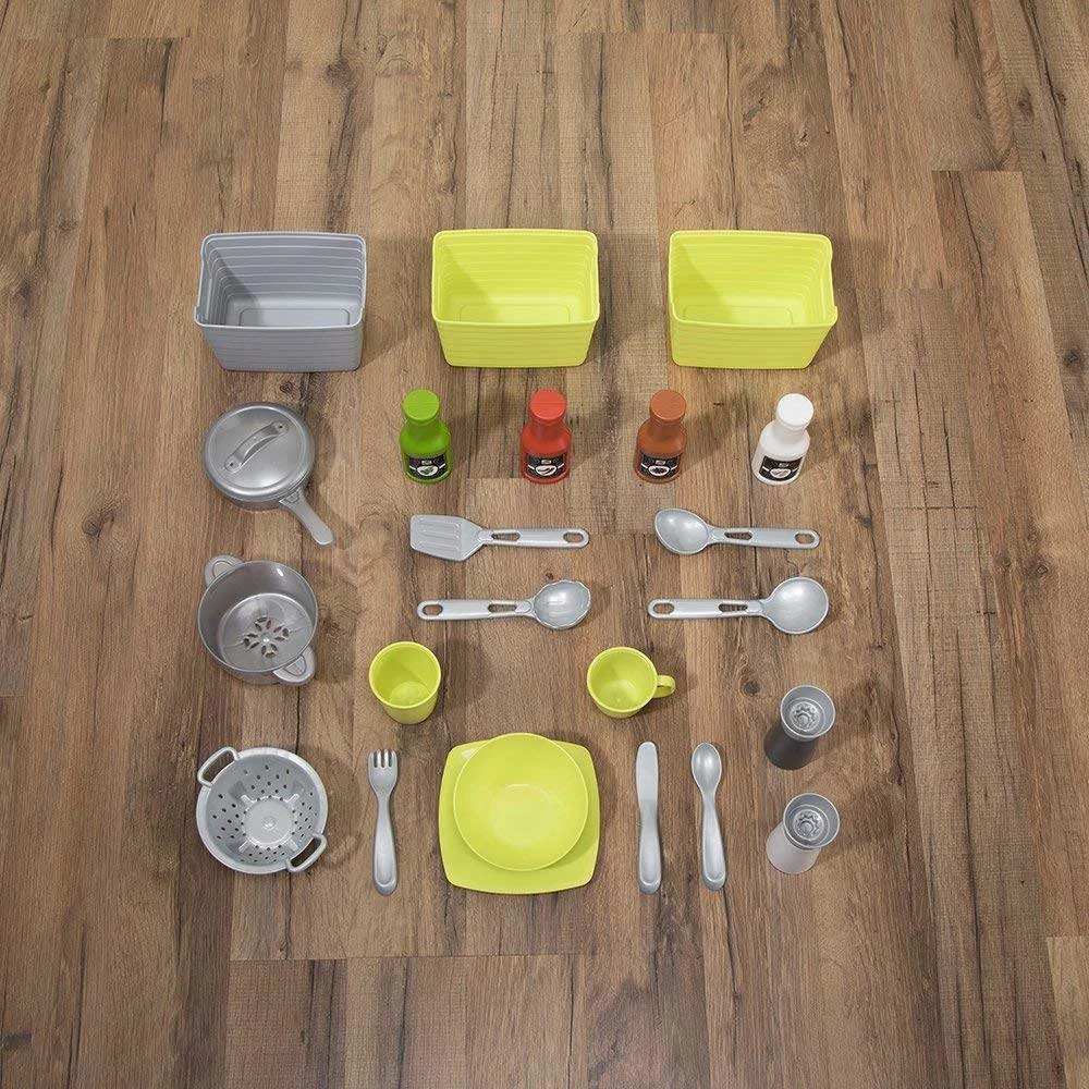 - Includes 24-piece accessory set with pots, pans, utensils, condiments, and others