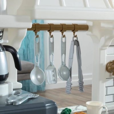 Junior chefs can play in style with the Gilded Gourmet Kitchen™ by Step2. Not only are there so many beautiful finishing and details to admire, there’s also so much to do! Pretend play gets a makeover with this small-footprint play kitchen that packs big play value in every station. Pops of gold in the sink faucet and appliance pulls offset the blue hues and faux subway tile backsplash, while the modern gray countertop provides plenty of space to prep pretend ingredients. Offer guests their favorite brew with the built-in coffee station and find everything you need in the windowed refrigerator and storage bins! Enjoy a snack with friends at the breakfast bar, serving up their favorite meal from the pretend stovetop with real working lights and sounds. Little ones can whisk, scramble, bake, and more at this play kitchen playset, with plenty of space for friends to assist. When playtime fun is done, built-in storage space ensures every accessory has a place after pretending to clean up with the large farmhouse-style sink! Made in the USA of US and imported parts.