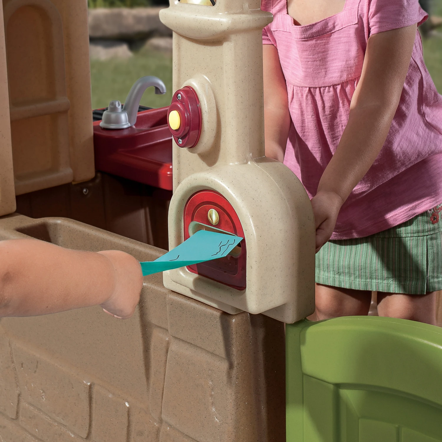 - Molded-in kitchen table, faucet, seat, and grill space encourage imaginative outdoor play!