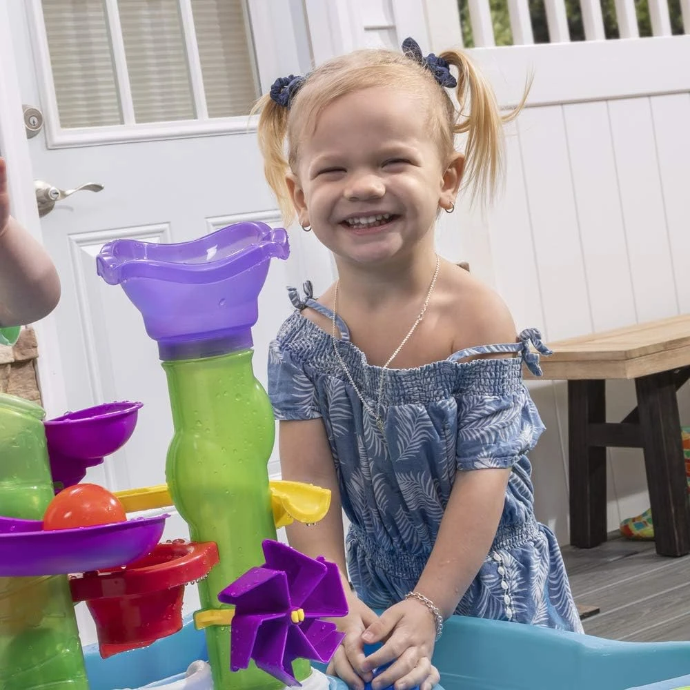 This summer, your kids will have a ridiculously good time as they play and splash around in the Lazy Maze River Run Water Table by Step2! That’s because there are a zillion (ok, maybe not exactly that many) fun activities for the kiddos to enjoy. Where to even begin? Maybe your little one will want to drop balls into one slide tower and fill the other one up with water, forcing the balls up and up until they eventually tumble out and work their way down the exciting maze. Or maybe they’ll decide to pour water over the spinners to make ’em splash like crazy. Or maybe they’d rather launch balls into the maze using the pair of side flippers. Honestly, they’ll probably just want to do it all! (Psst, as a bonus, they’ll also be secretly developing their own fine motor skills and learning about cause-and-effect play at the same time.) A built-in drain plug makes clean-up super fast and easy. Made in the U.S.A. with some imported parts.