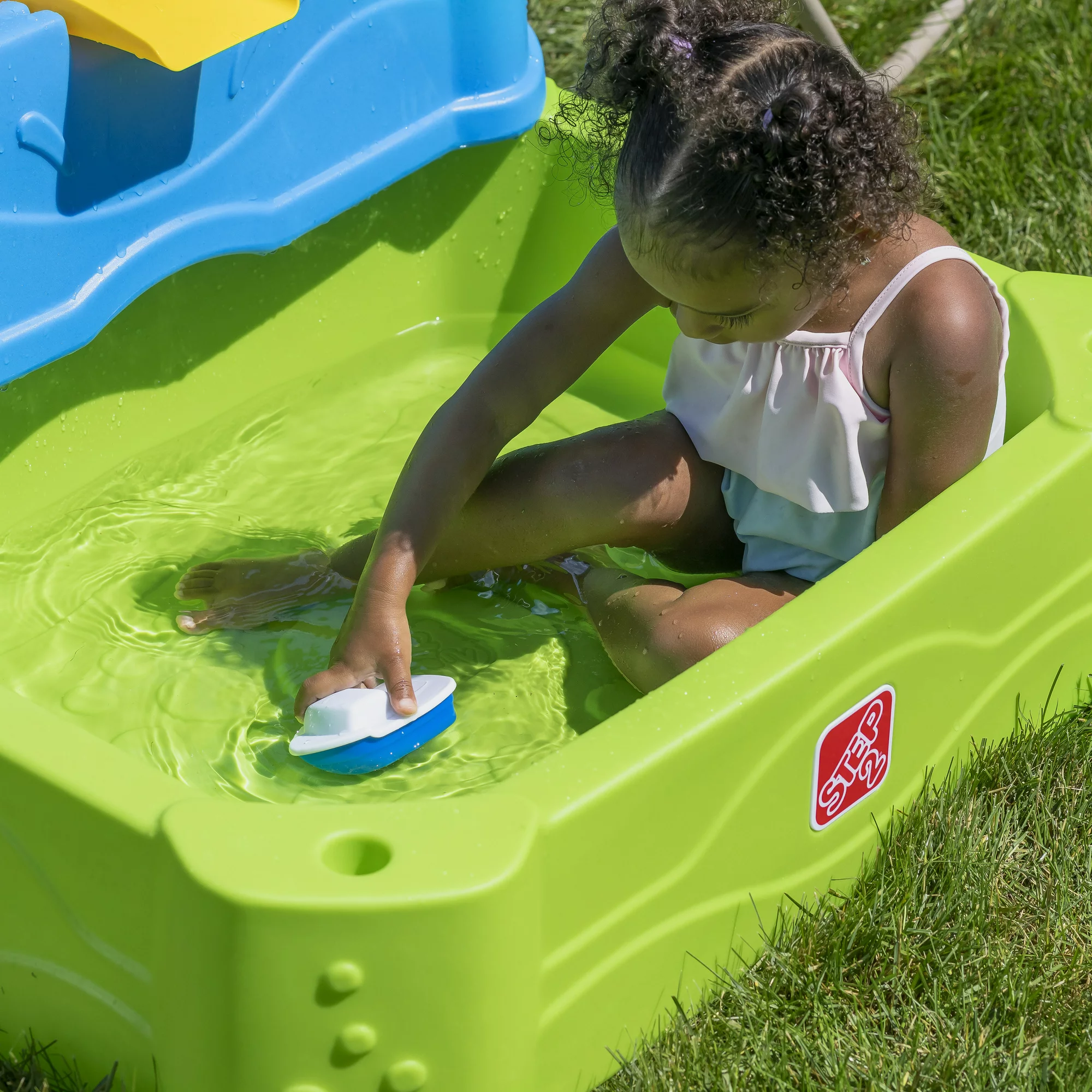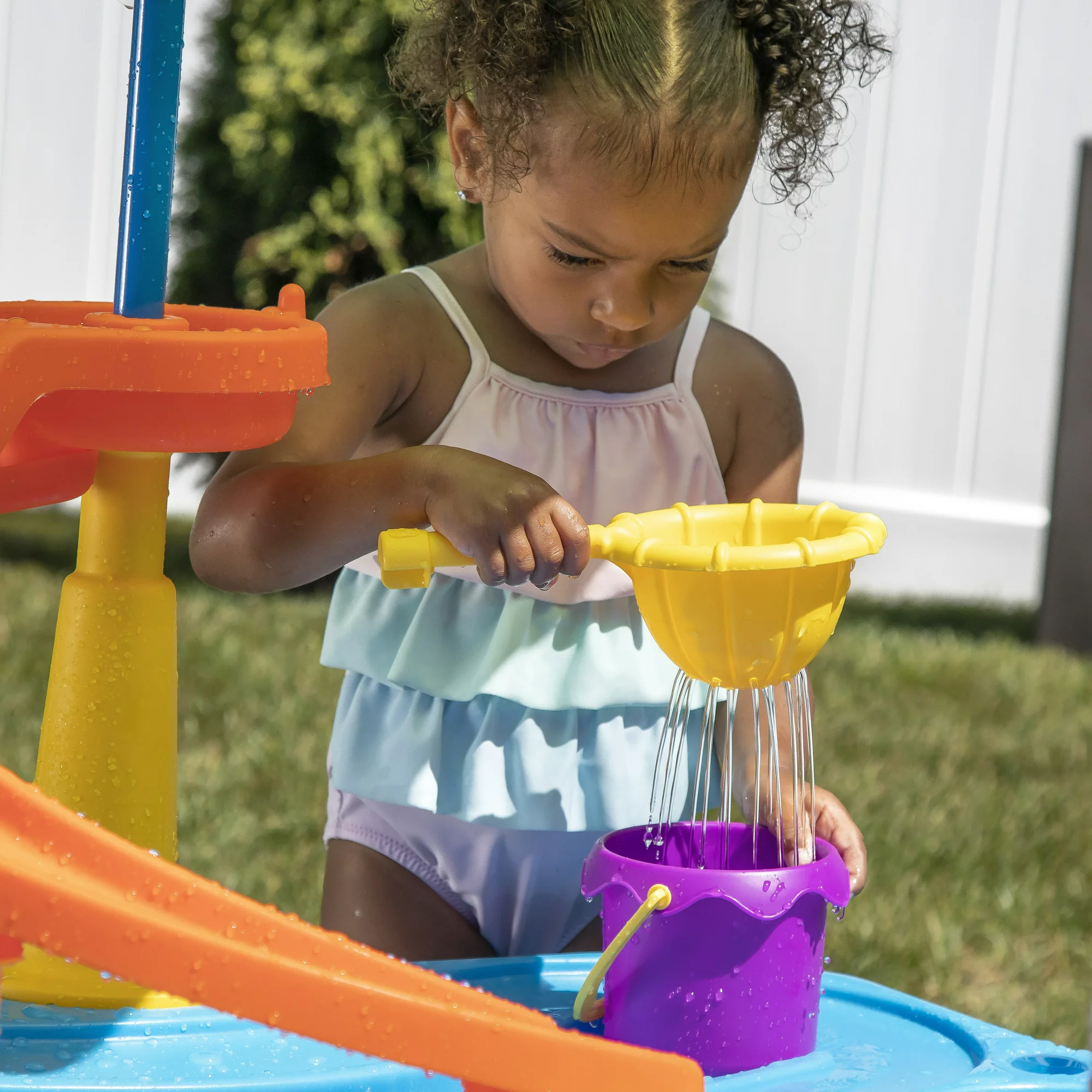 - Step2 two-level water table features a towering water slide with spill-over tray, drawbridge, sprinkler attachment, and more!