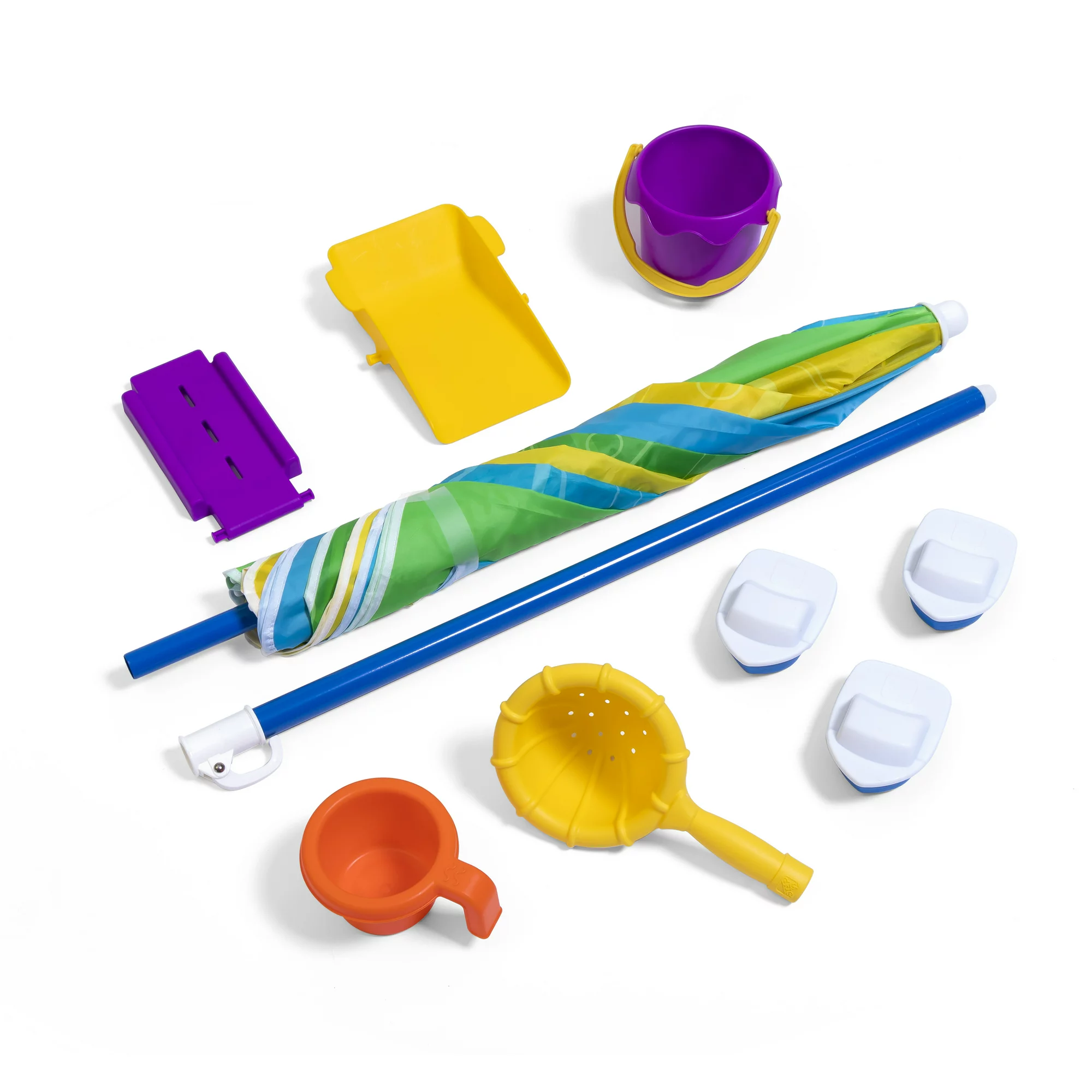 - In the box: two-level water table, strainer, bucket, cup, three boats with wheels, sprinkler attachment, and umbrella.