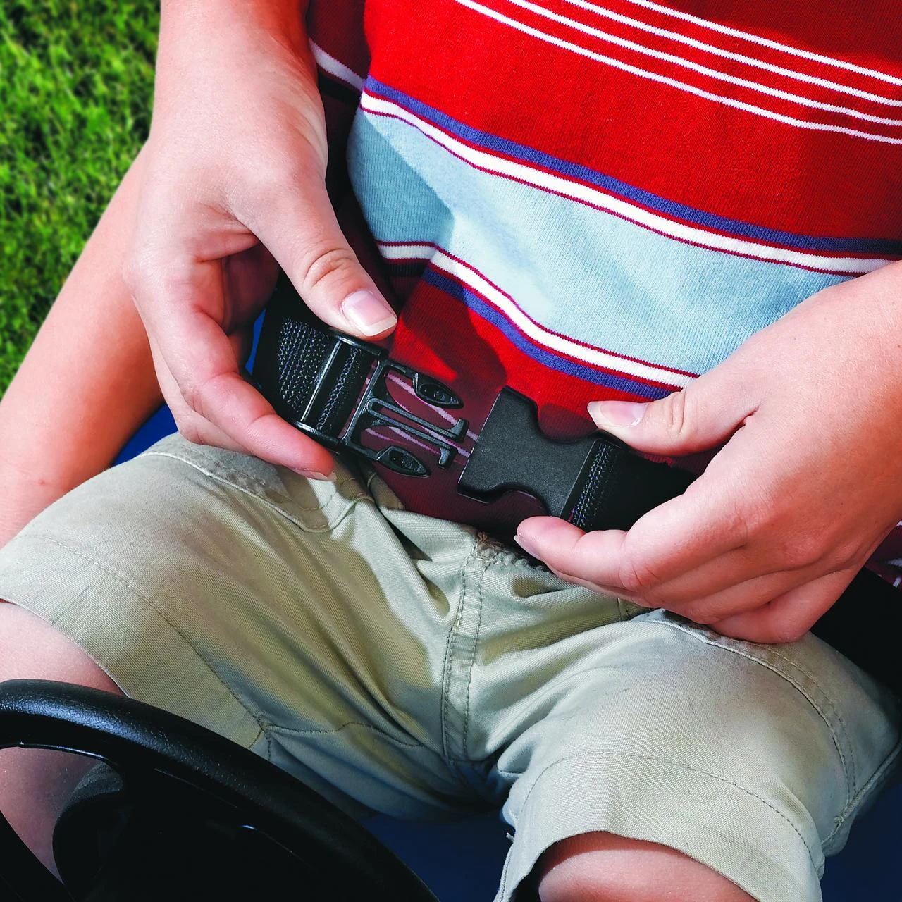 Buckle up with the included seat belt, pack some snacks in the under-hood storage, and use the cup holders for drinks located in the push handle and by the child’s steering wheel.